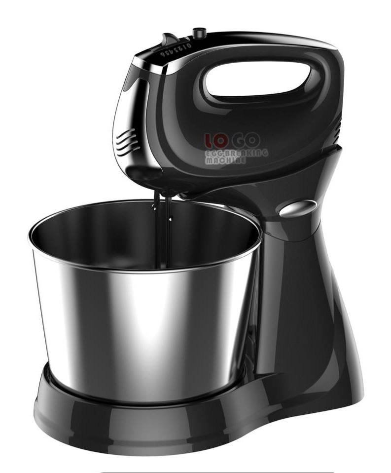 MISTURADORA COM SUPORTE ♦Motor potente de 300W (250W opcional) ♦Cinco velocidades com função turbo ♦Botão de ejeção disponível ♦Com dois batedores cromados e ganchos para massa ♦Com tigela rotativa em aço inoxidável, capacidade 3000ml